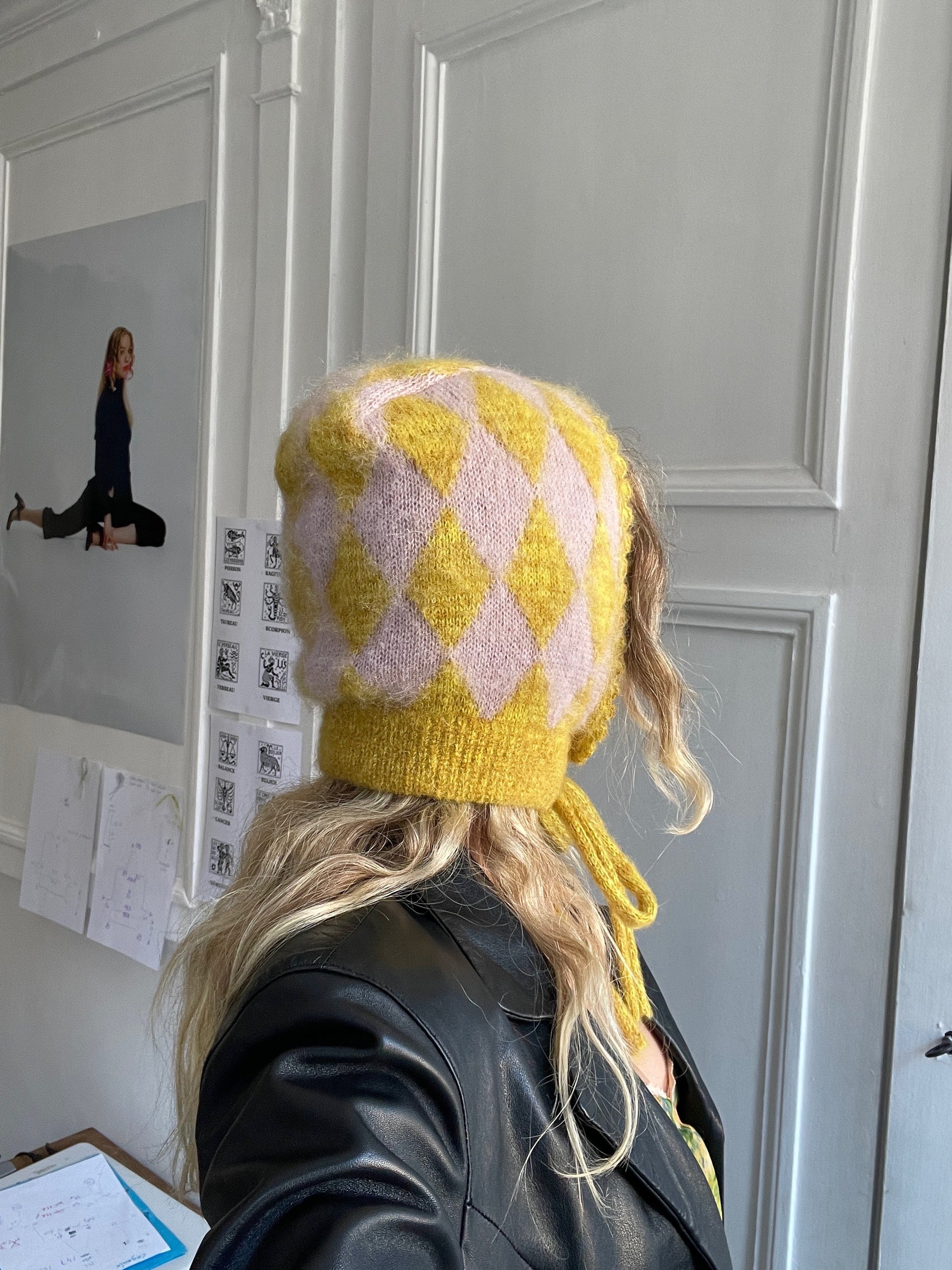 Our Acid Mustard and Dusty Pink mohair Balaclava. The perfect blend of warmth and style. Made with mohair, this balaclava keeps you cozy during winter while allowing you to customize the fit with adjustable ties. It's made to order, and knitted by us in our workshop in France.