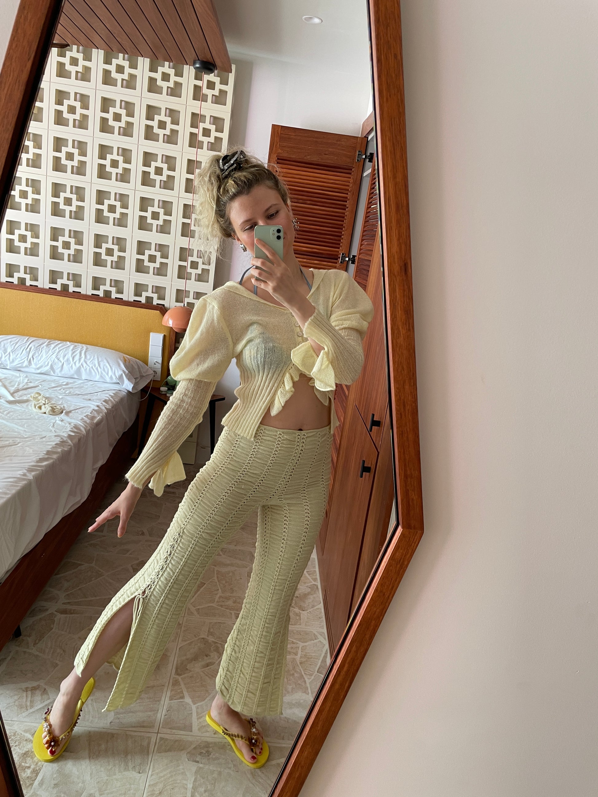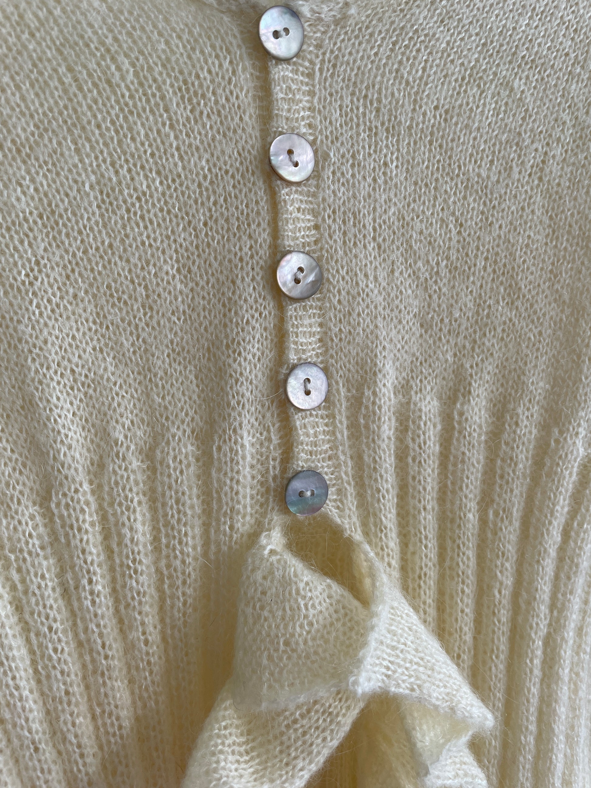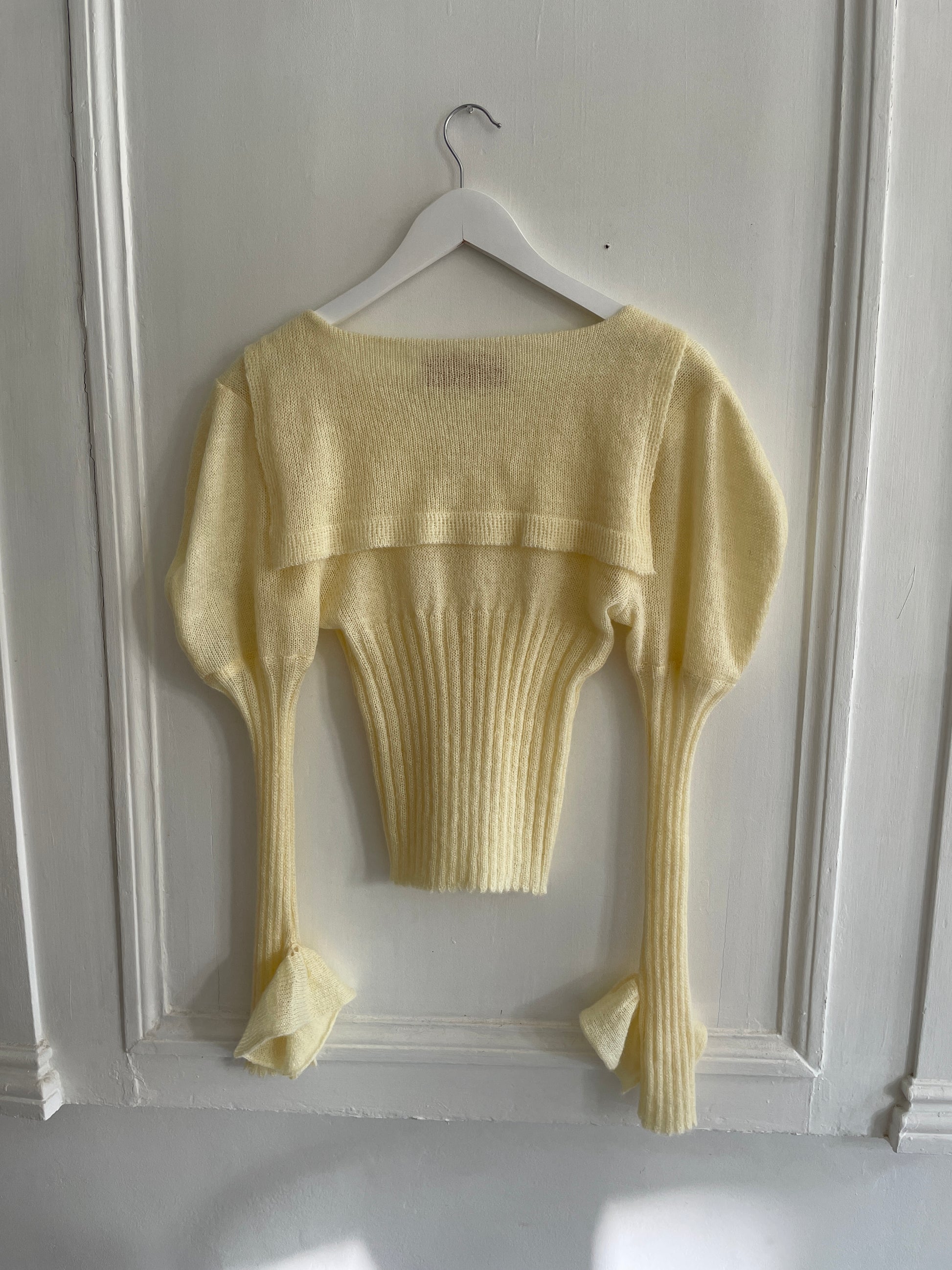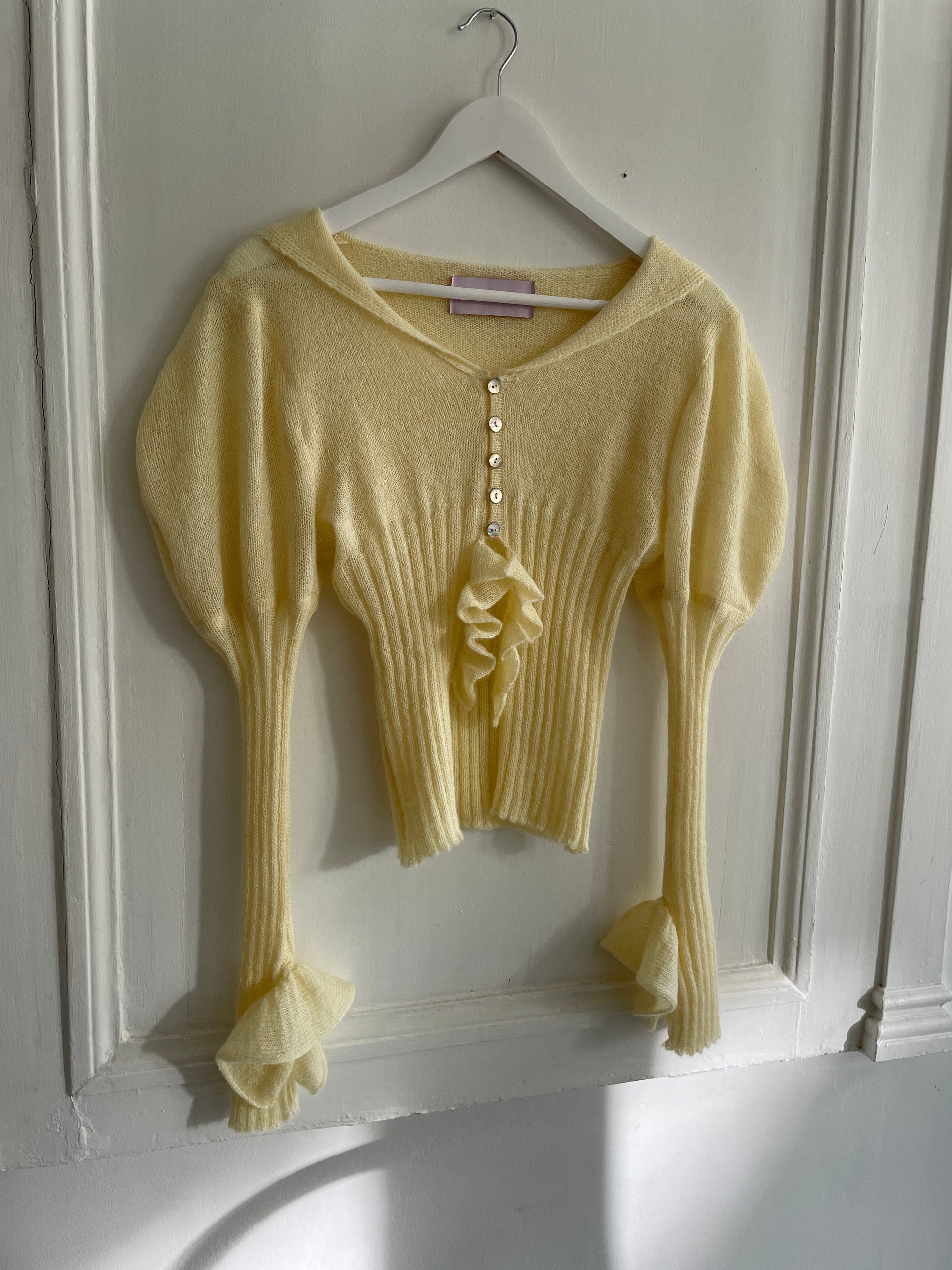 A new version of our sailor cardigan. Knitted with a single strand of yarn, making it lighter and more sheer! It features ruffle details on the cuffs and at the waist. It creates an incredible silhouette.
