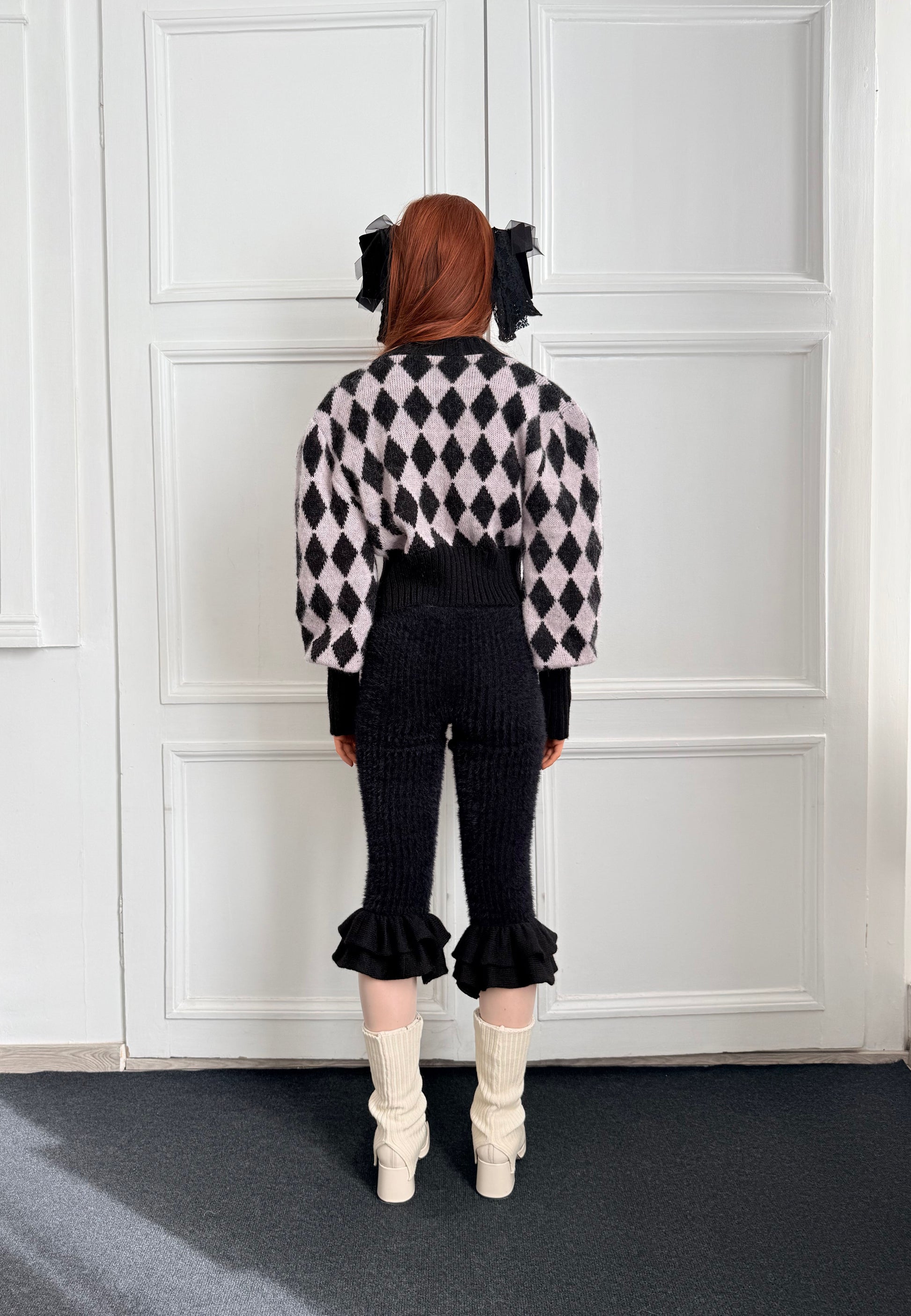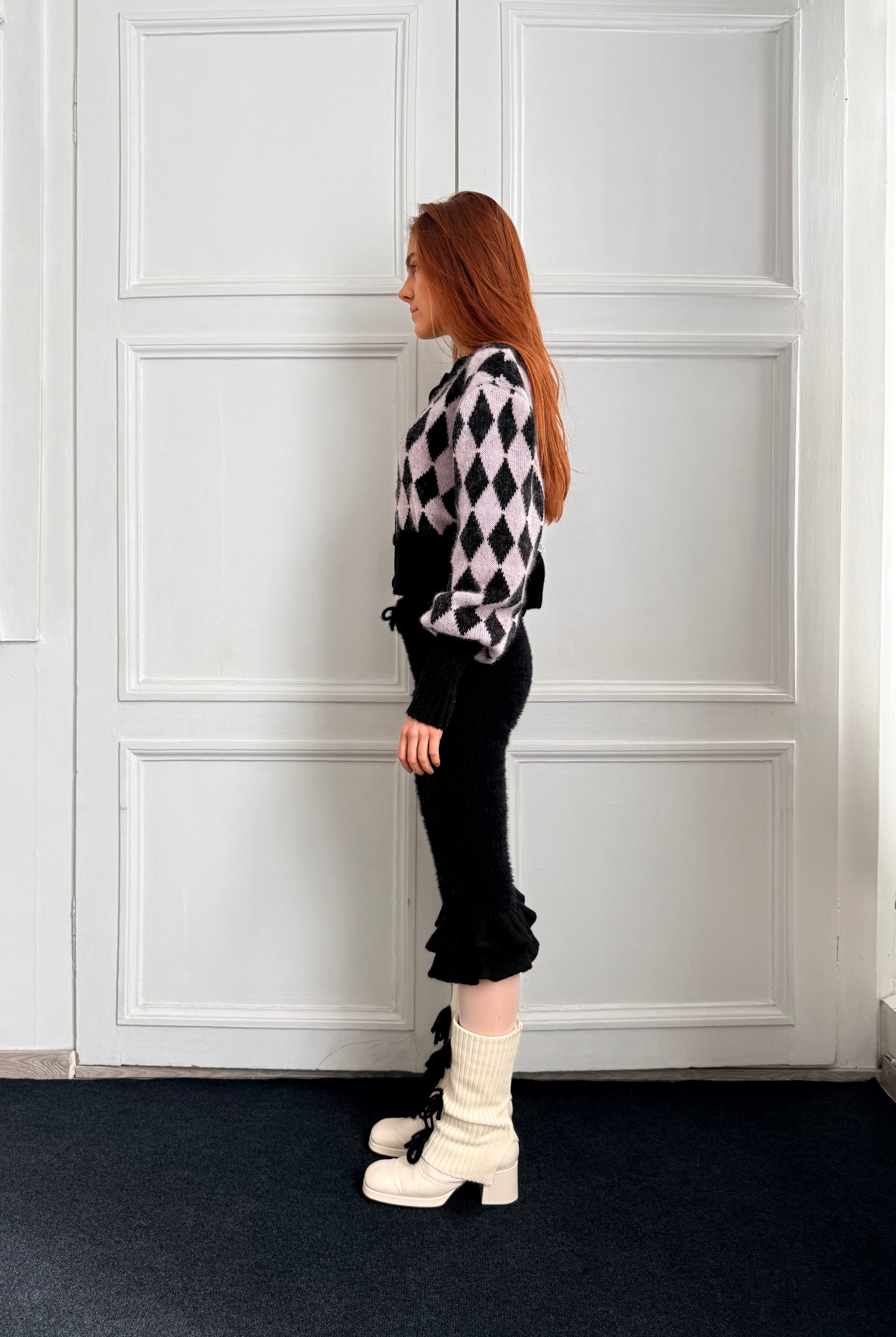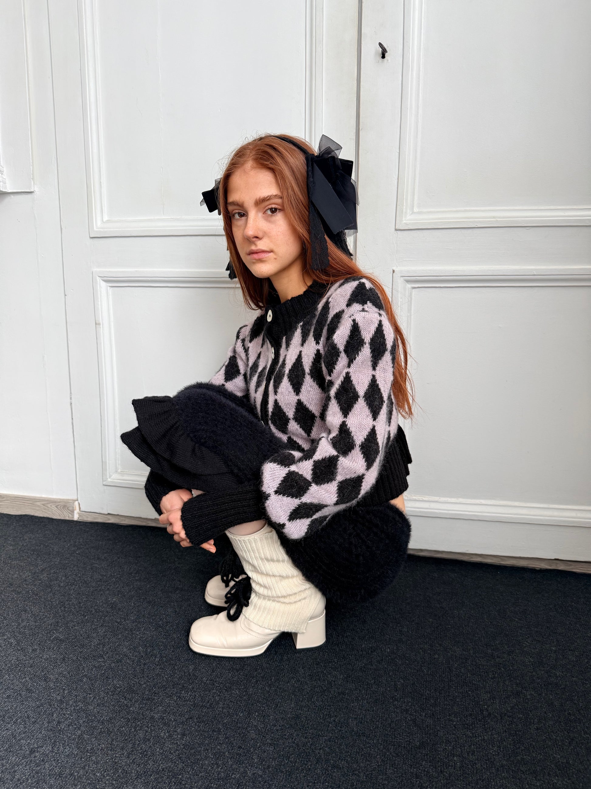 Our Pink and Black Diamond Cardigan, made to order by us, with long fitted cuffs and puffed sleeves, and mother-of-pearl buttons.