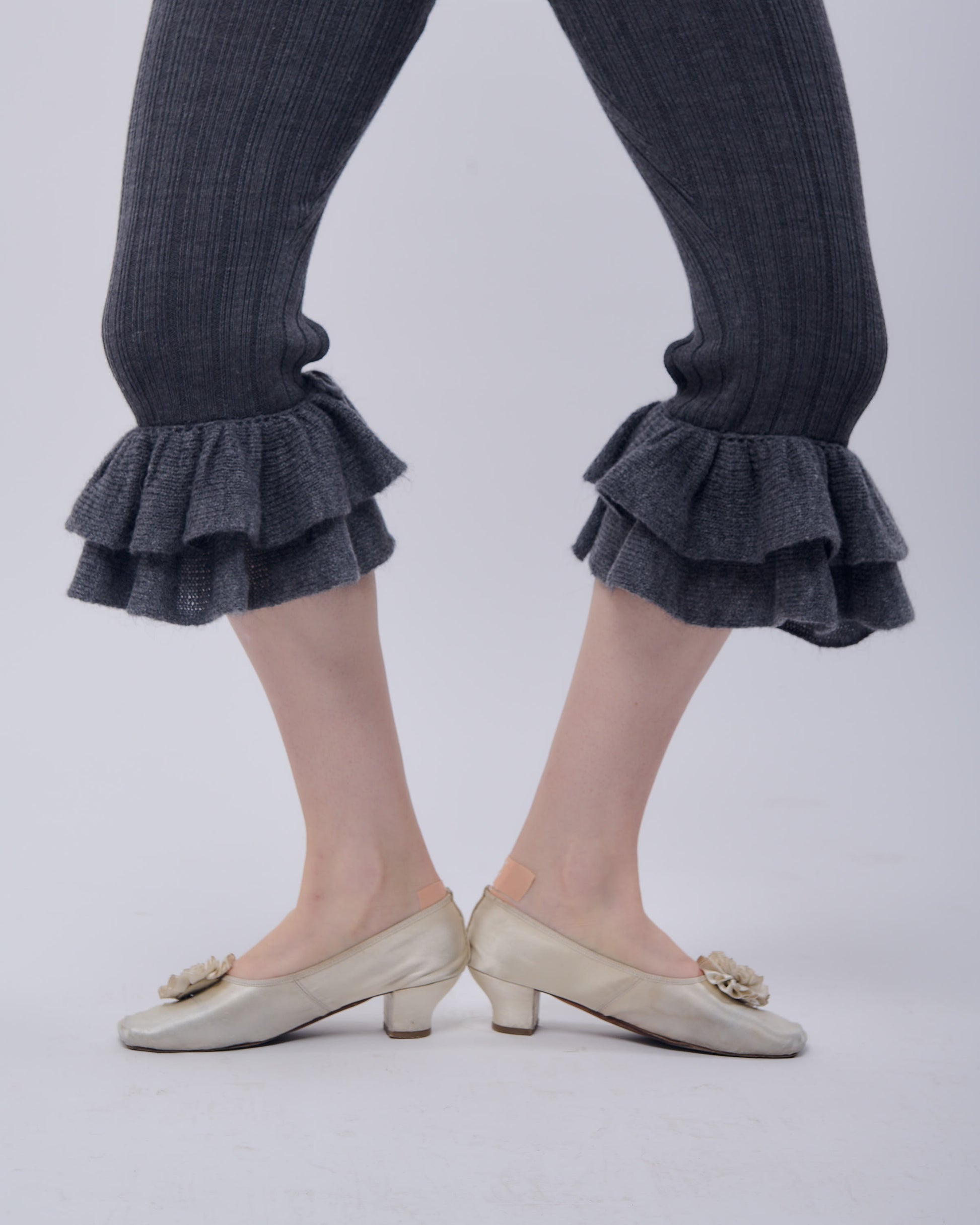 Capri pants with a drawstring at the waist, stretch stitch, featuring a double ruffle detail at the bottom. Made and knitted to order by us. Finished with a dainty tie at the back of the calf.