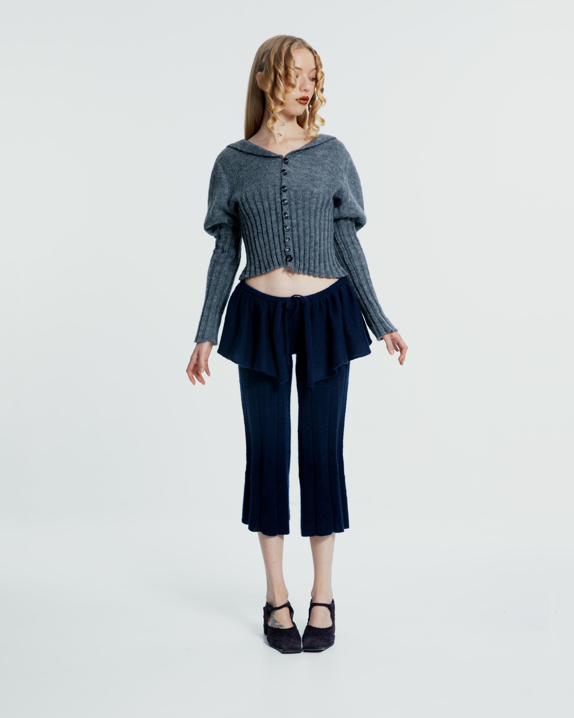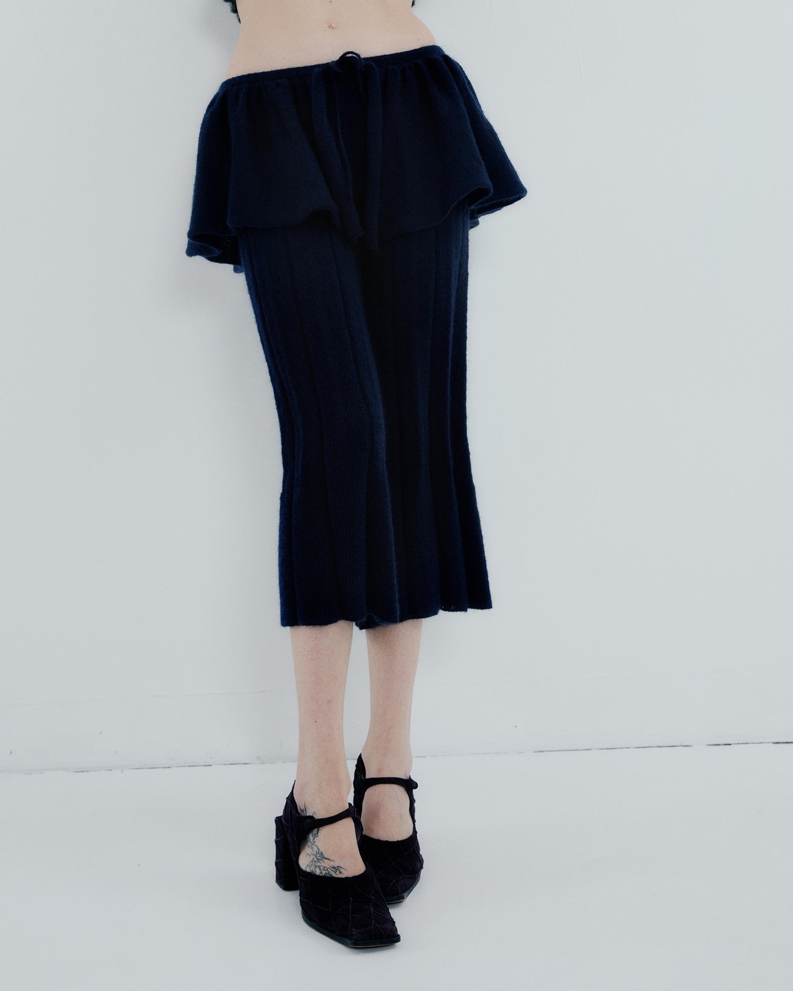 Mid-rise pants with an integrated voluminous skater mini skirt. Adjustable with a drawstring. Pleated leg with large ribbed stitch.