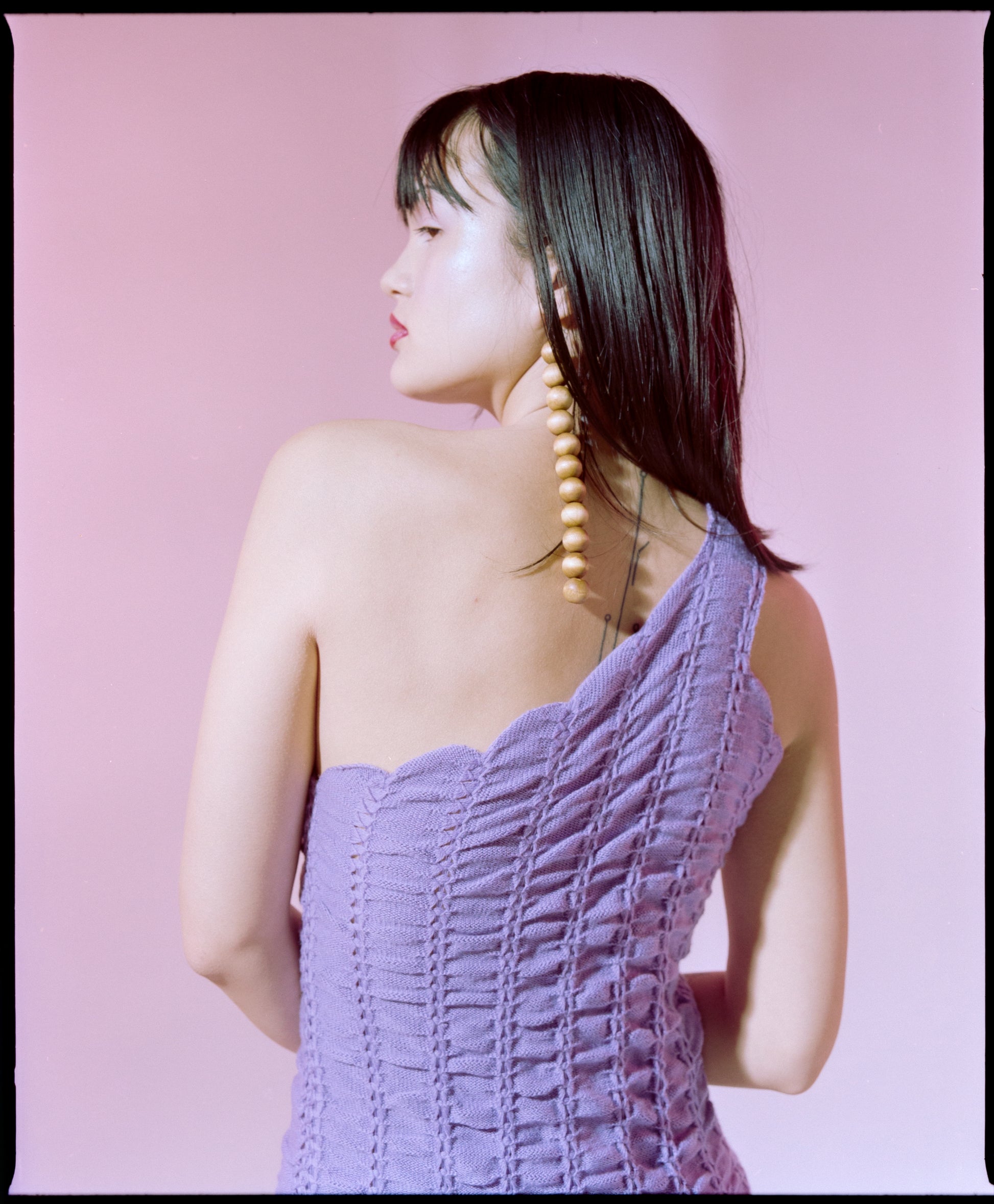 One-shoulder dress / Two slits on the front / Eyelet detail and cord / Textured knit effect