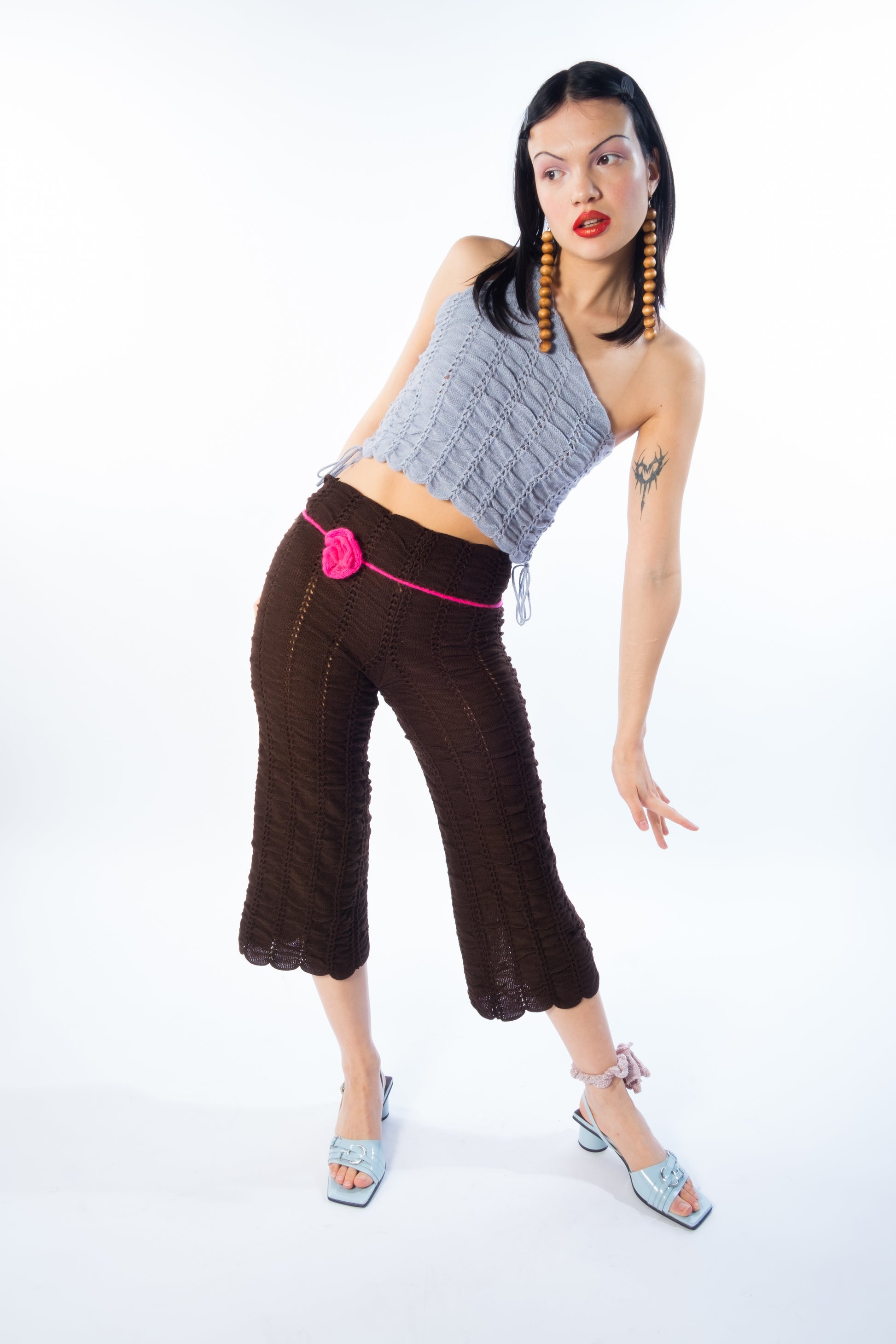 Elastic waist / Slit at the back / Eyelet detail with cord / Calf-lenght / Textured knit effect