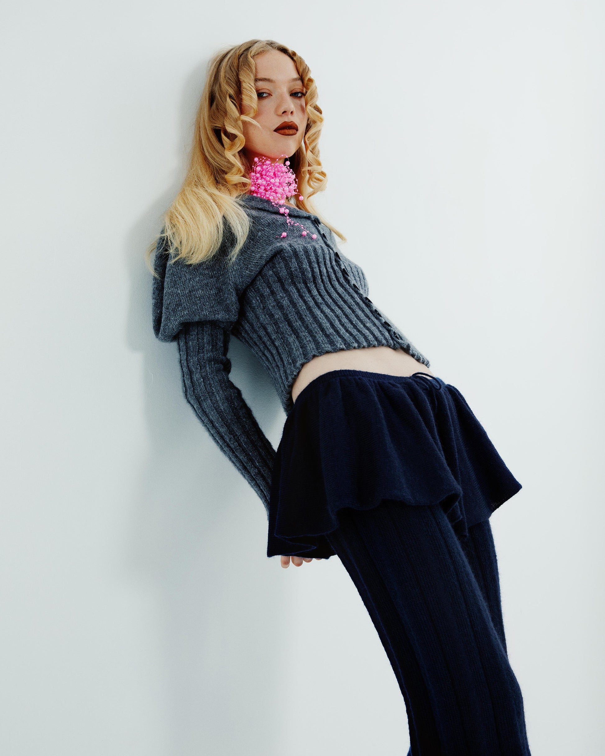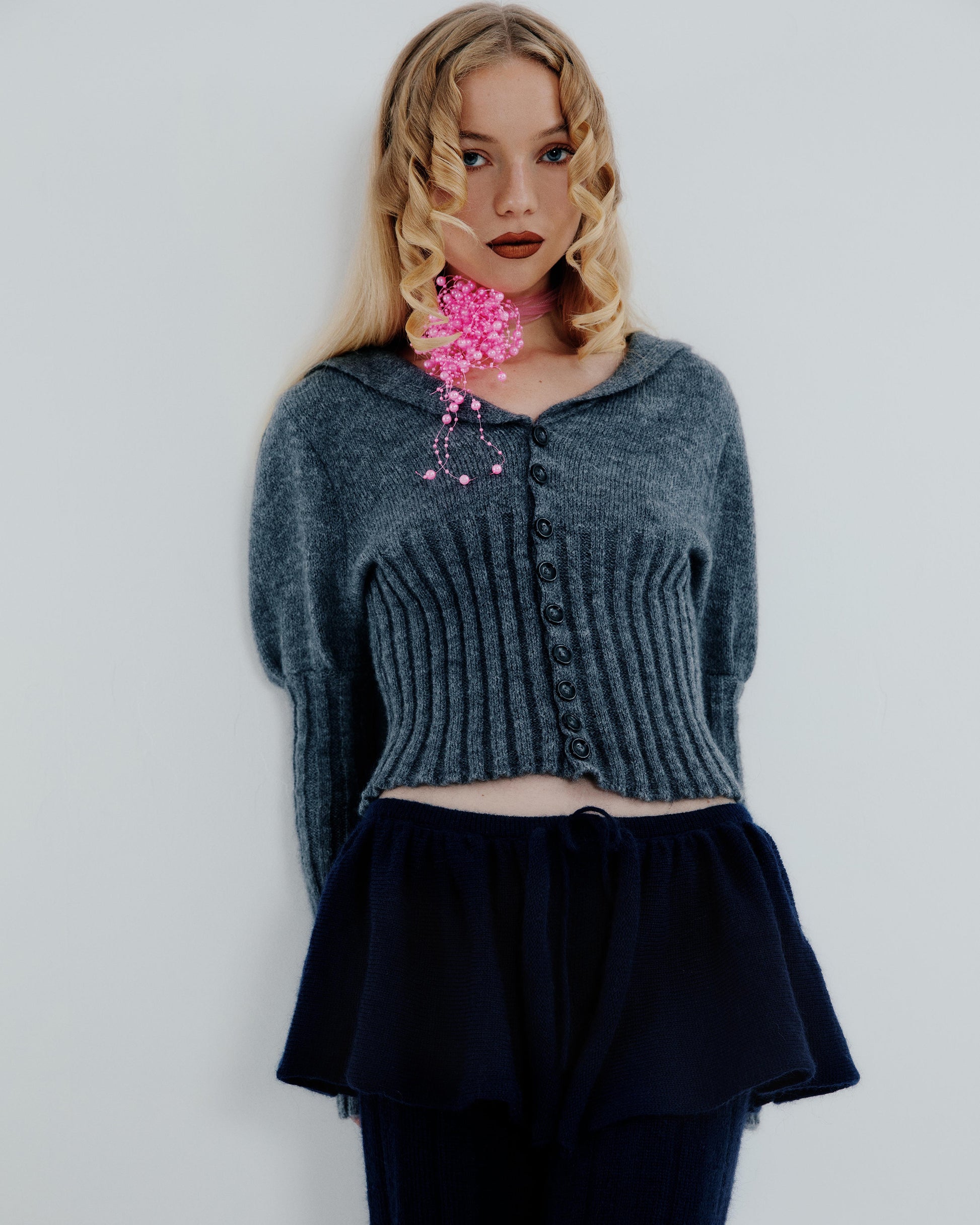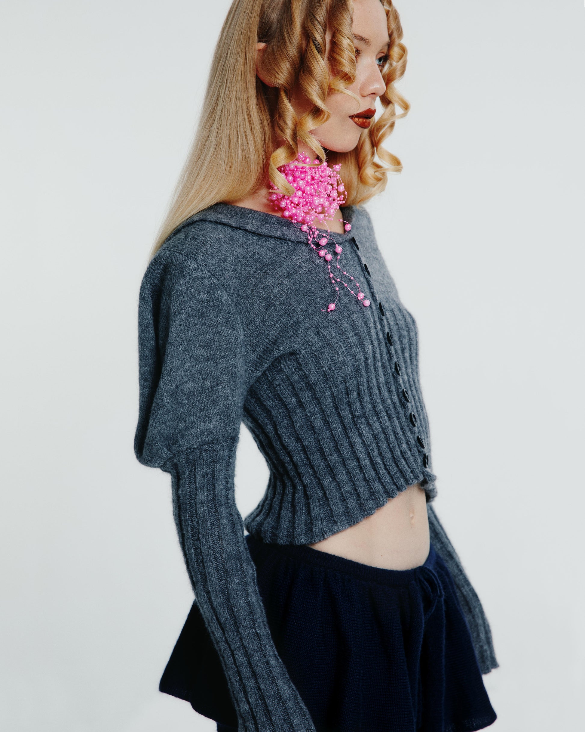 An elegant grey mohair cardigan with a sailor collar that adds a retro and refined touch. It buttons up at the front, and its fitted cut flatters the silhouette. This piece also features balloon sleeves that create a unique look.
