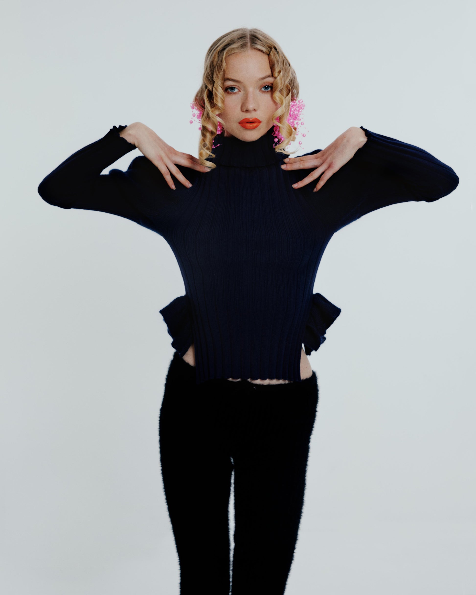 We named it 'Pourpoint' because its shape reminds us of this classic garment, with a defined waist. For us, it’s a modern take on the iconic navy sweater. We designed it to be versatile, making it your new 'everyday' sweater. In solid navy blue, with a subtle variation in shade at the shoulders and on the ruffles for a refined touch.
