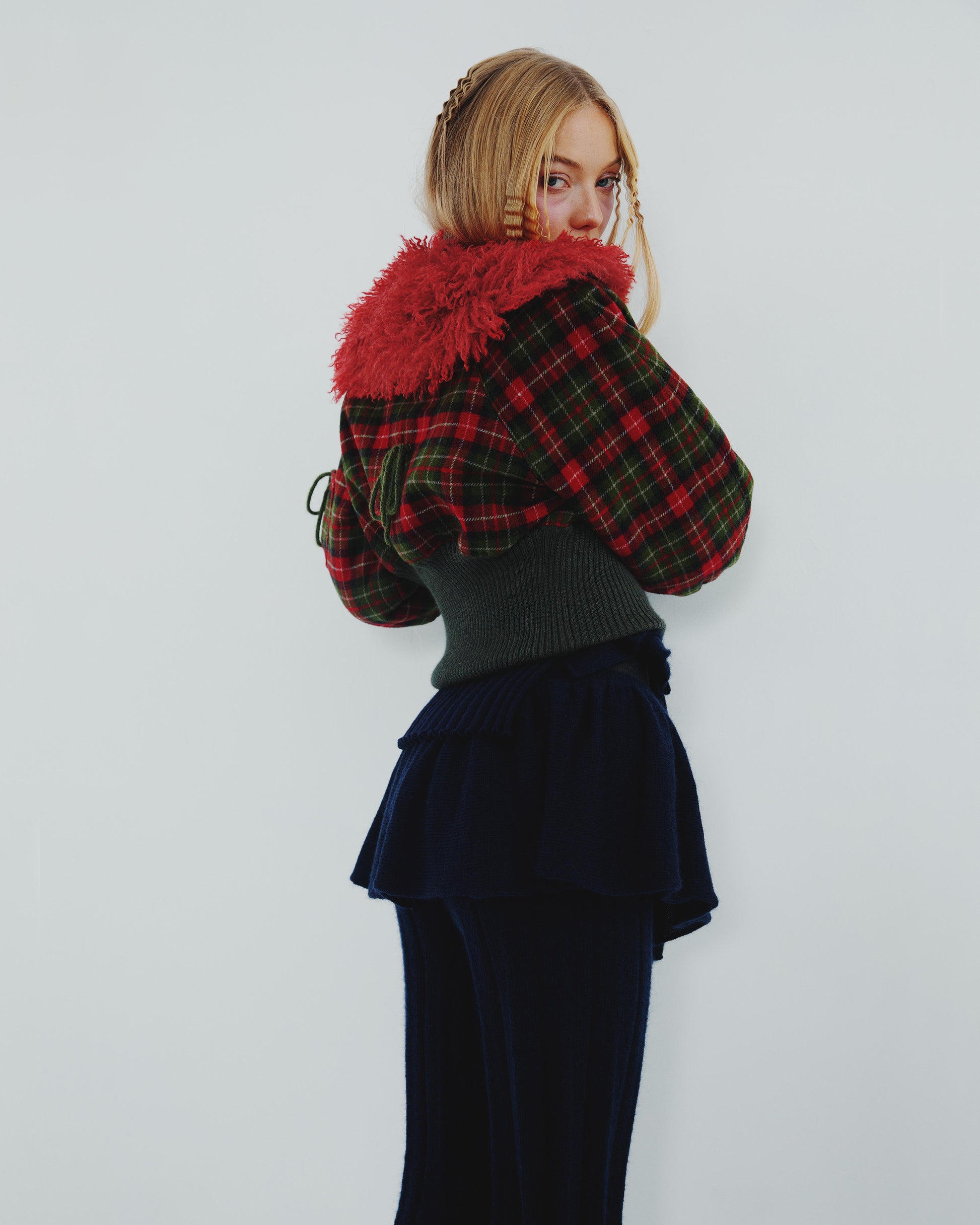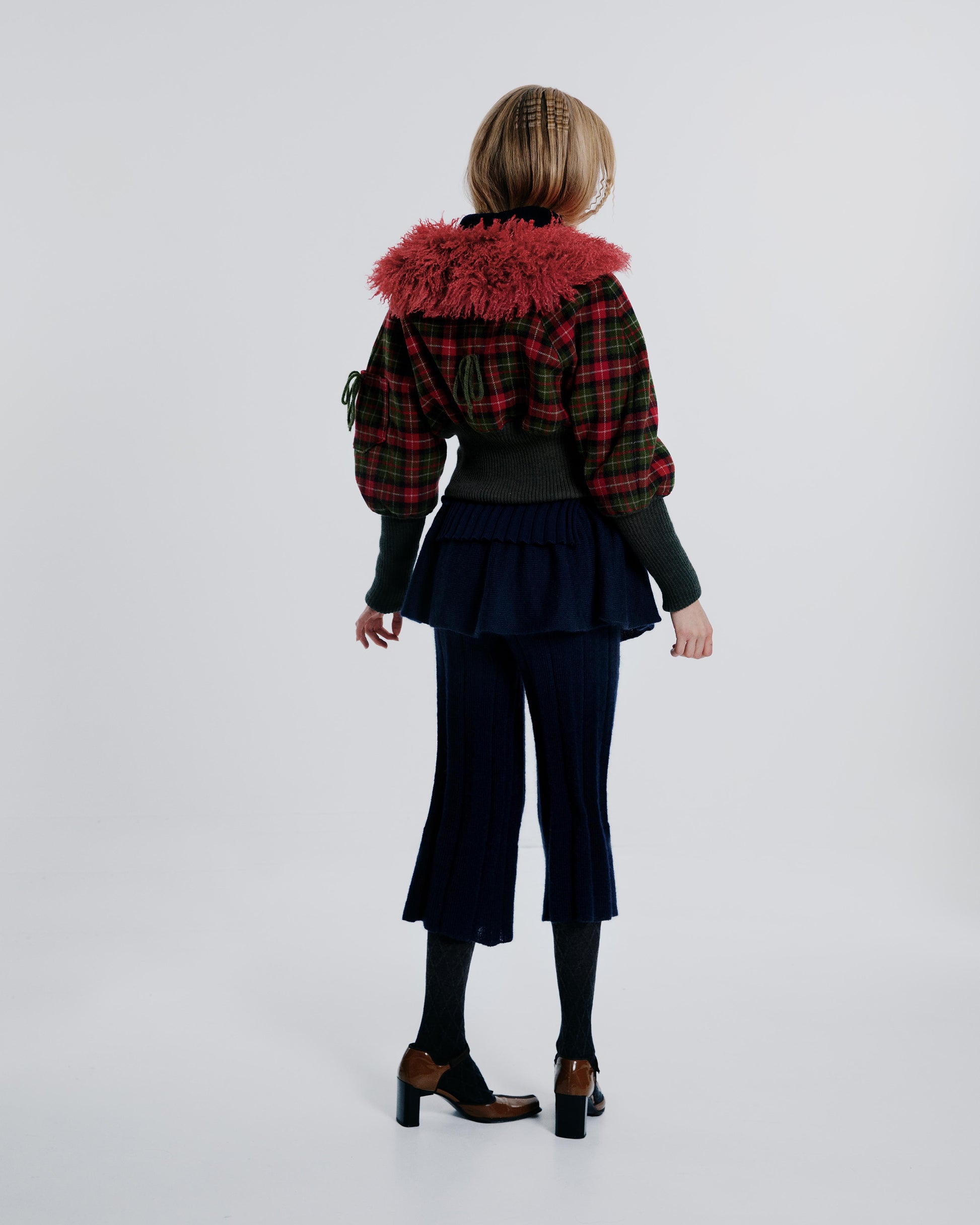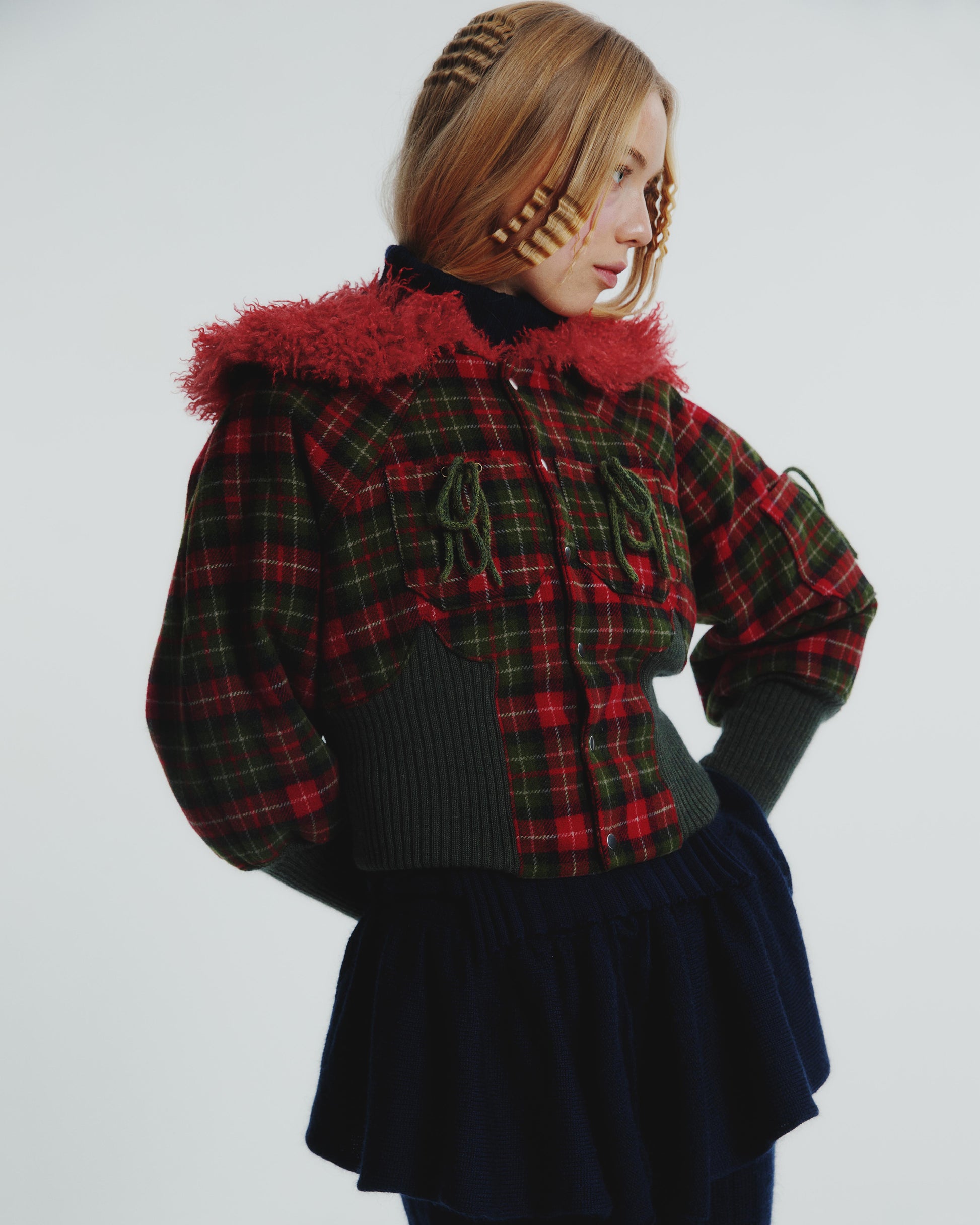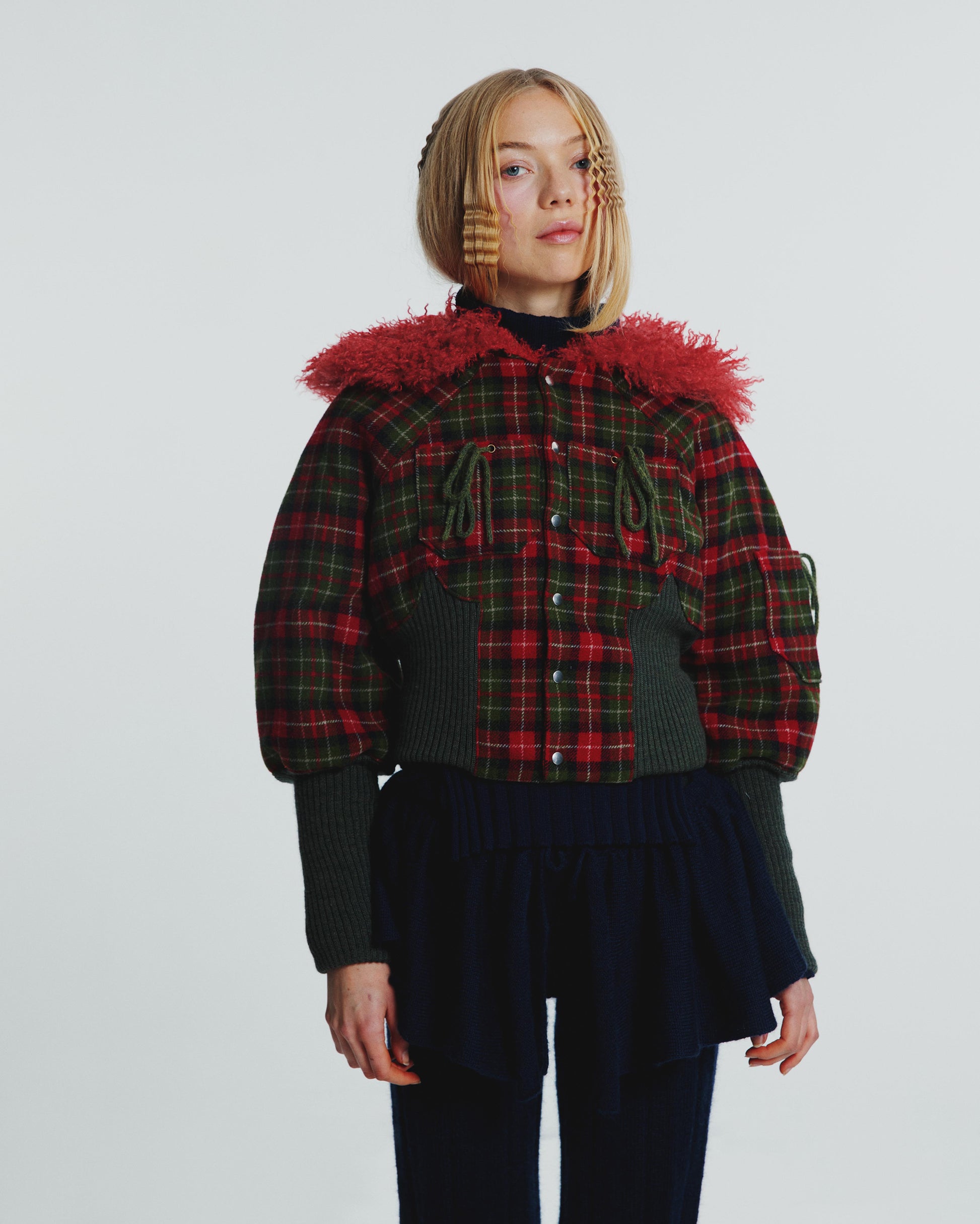 The Chalice bomber jacket features oversized cuffs and puffed sleeves, with a fitted bodice to create an incredible silhouette! It includes front pocket details with small knitted bows, adding a playful touch. This is a truly 'monumental' piece, complex to create, and filled with intricate details.