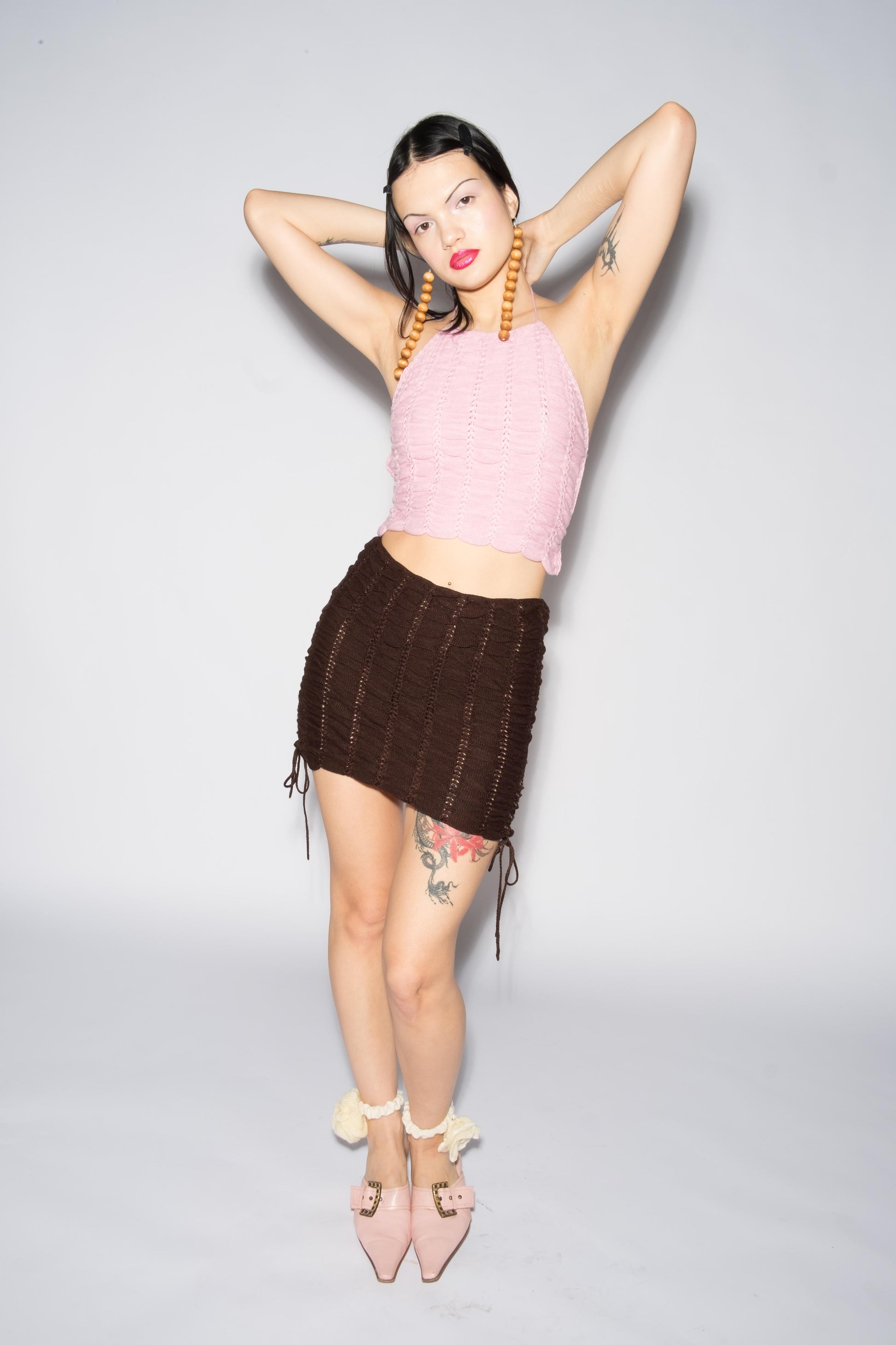 Elastic waist / Slit at the back / Eyelet detail with cord on the sides / Textured knit effect
